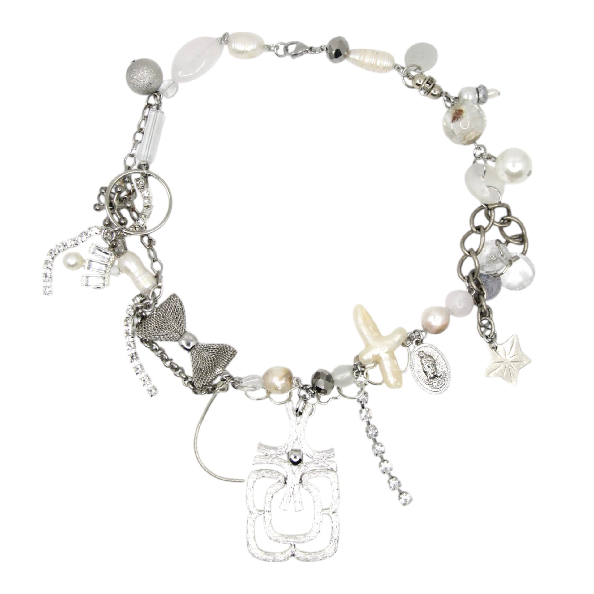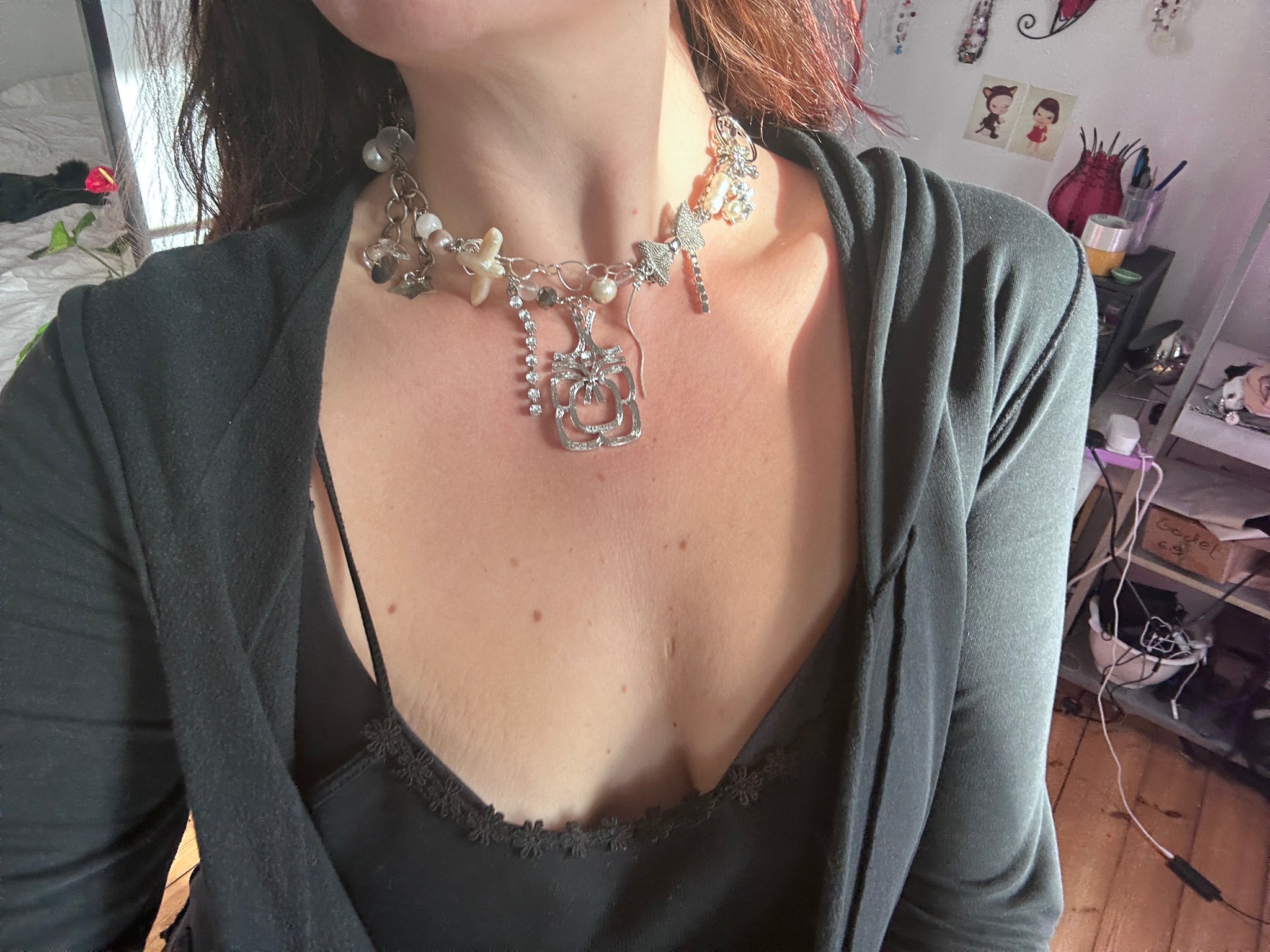One of a kind necklace made with various up-cycled materials. Features freshwater pearls, glass beads and secondhand chain elements.