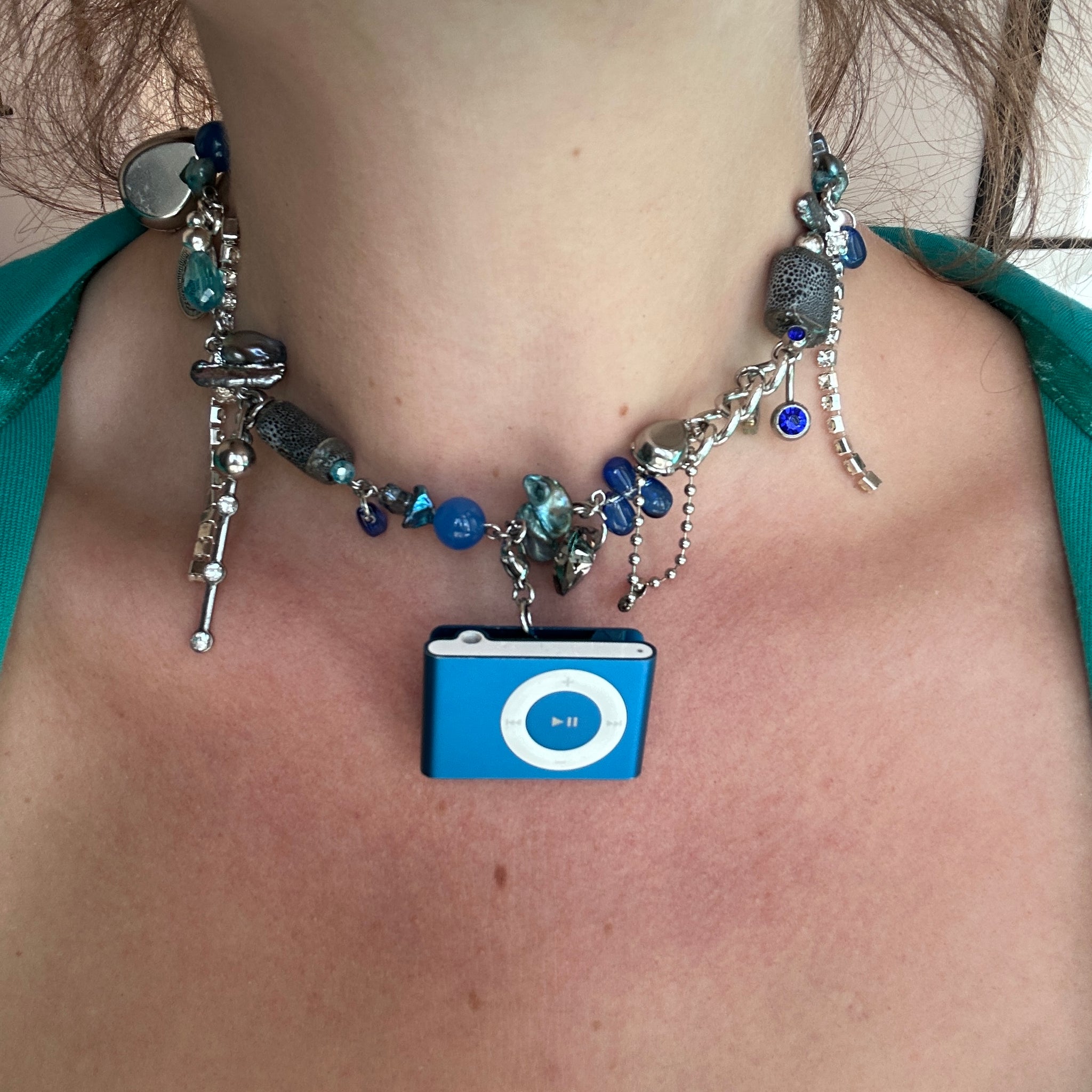 One of a kind handmade necklace made with up-cycled freshwater pearls, glass beads and secondhand chain elements. Features a functioning iPod shuffle pendant. The iPod itself is removable and can be fastened onto anywhere. Comes with a usb connecting charger lead to add your own music (you will need to reset it and sync it to your own library).