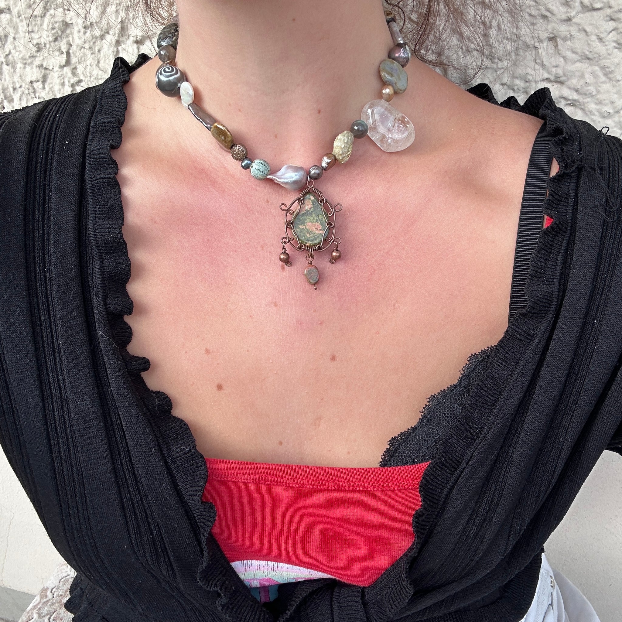 One of a kind necklace made with up-cycled freshwater pearls in various hues and shapes. Features a glass teddy bear pendant.