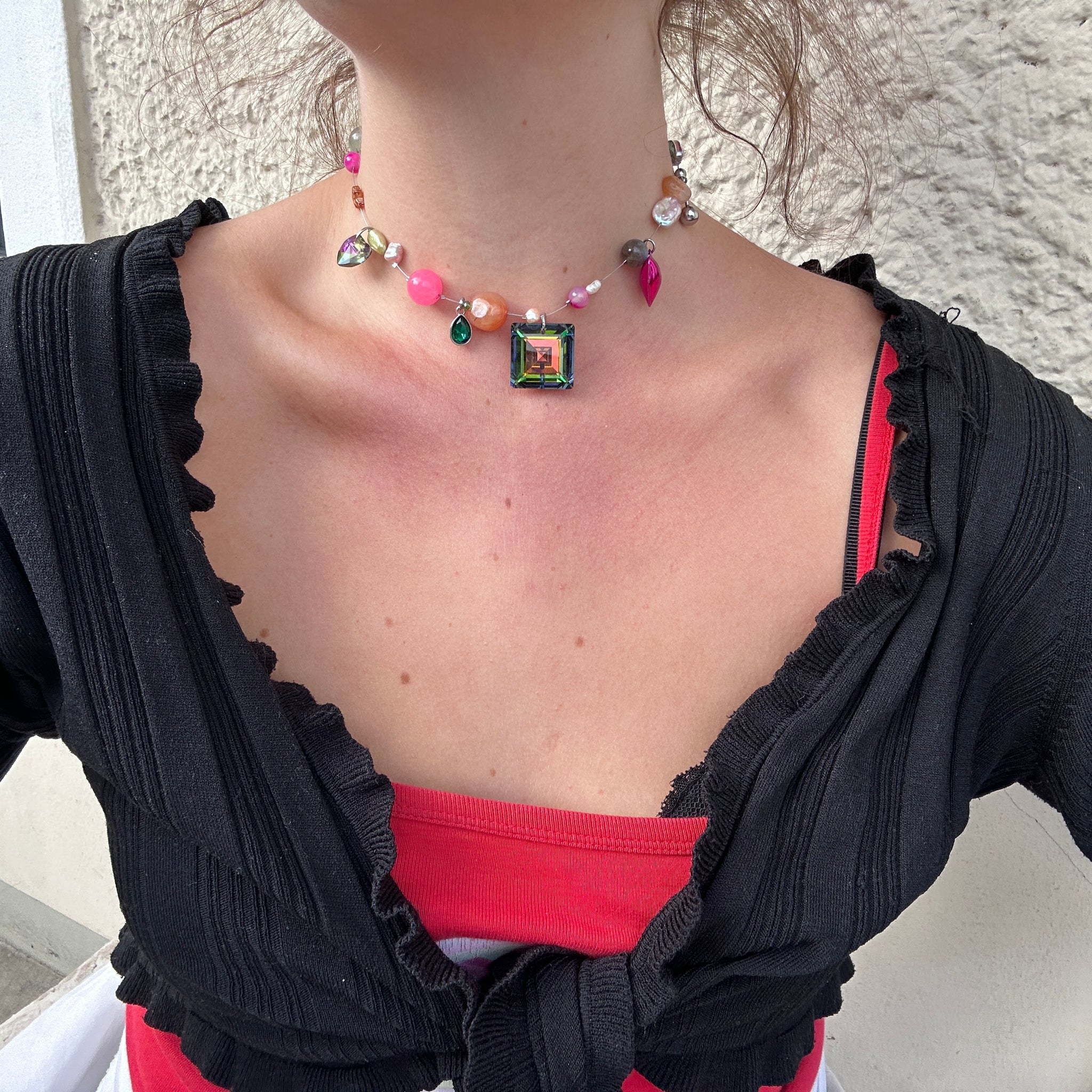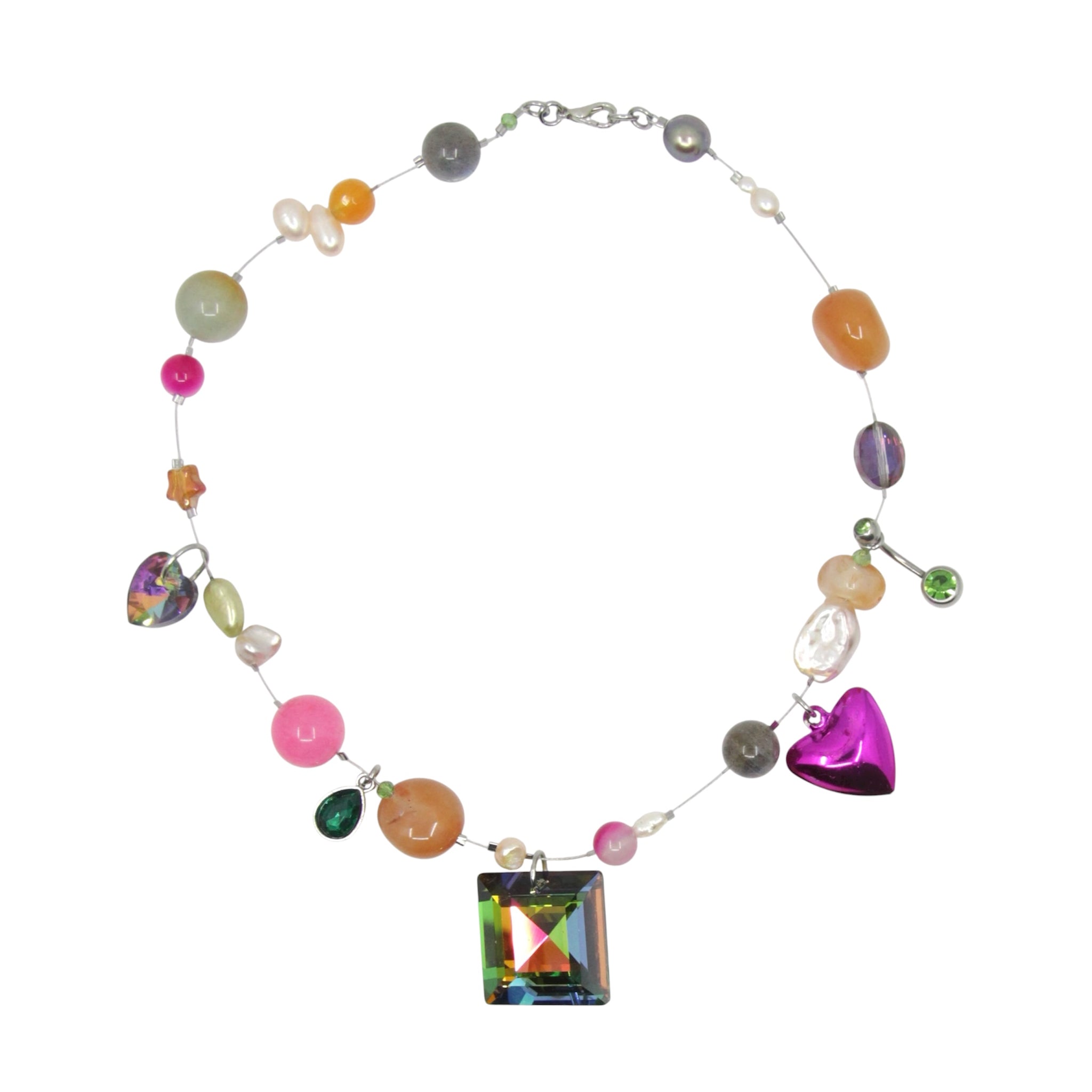 One of a kind necklace made with various up-cycled freshwater materials, including freshwater pearls and glass. Features an iridescent glass pendant.