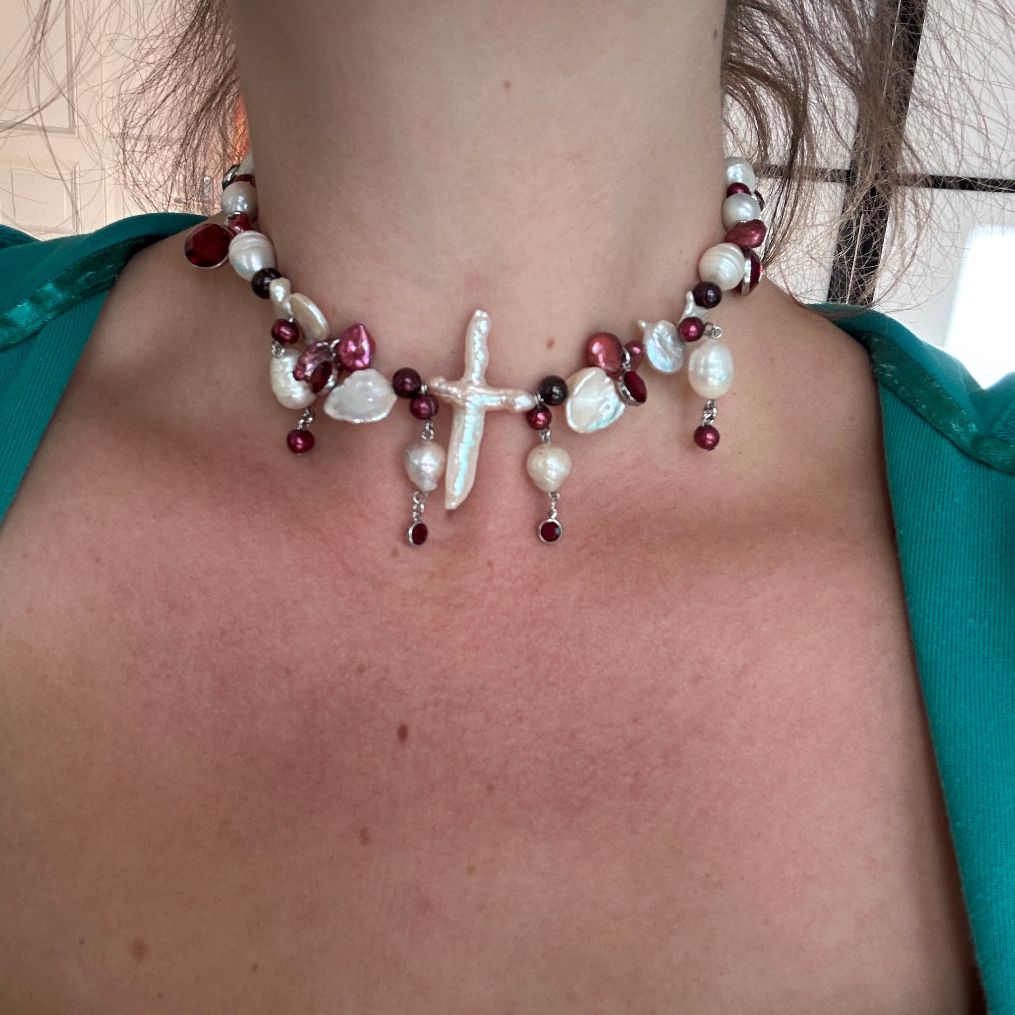 One of a kind necklace made with up-cycled freshwater pearls in various hues and shapes, and secondhand glass crystal charms. Features a large baroque pearl cross pendant.
