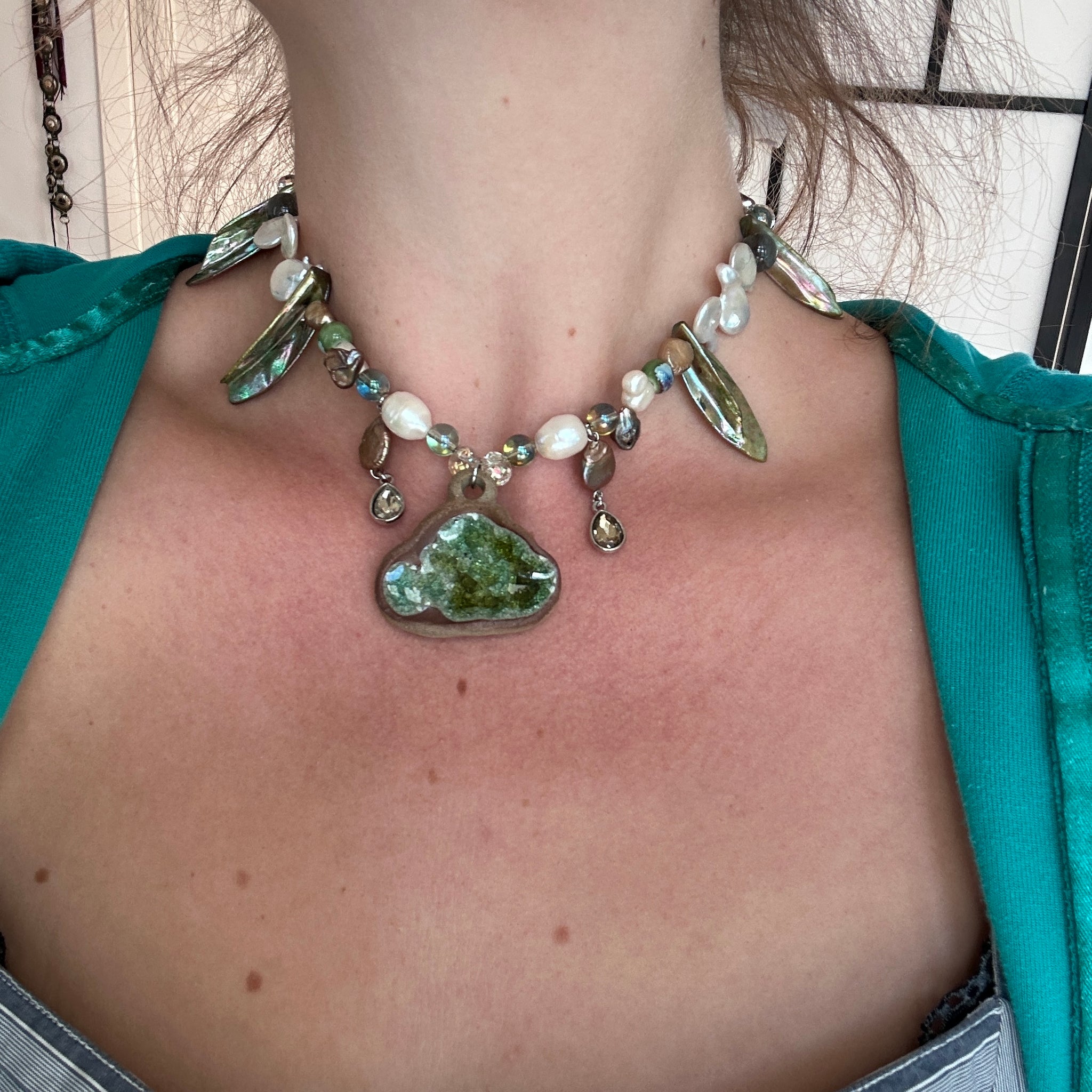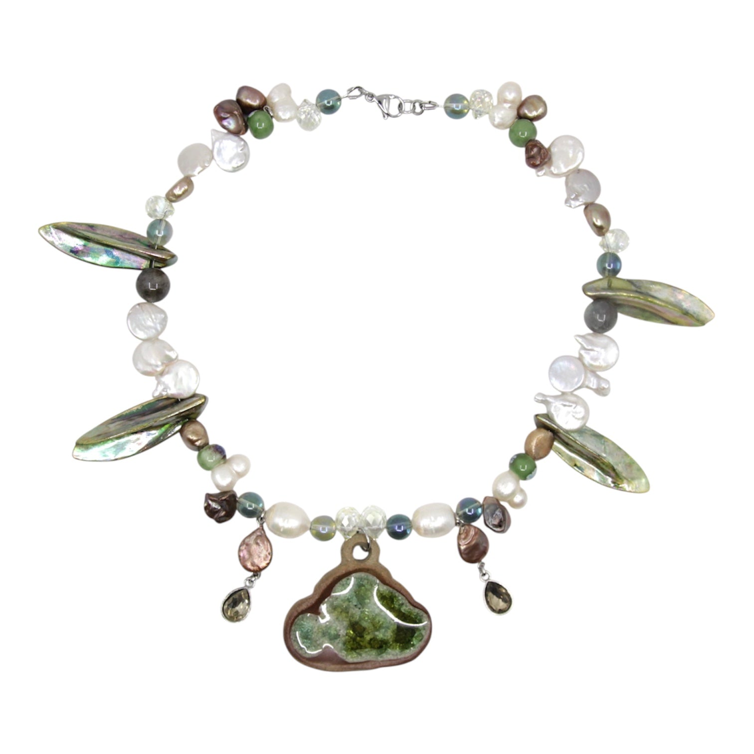 One of a kind necklace made with glass beads, shell and up-cycled freshwater pearls in various hues and shapes. Features a handmade pendant from Thailand.
