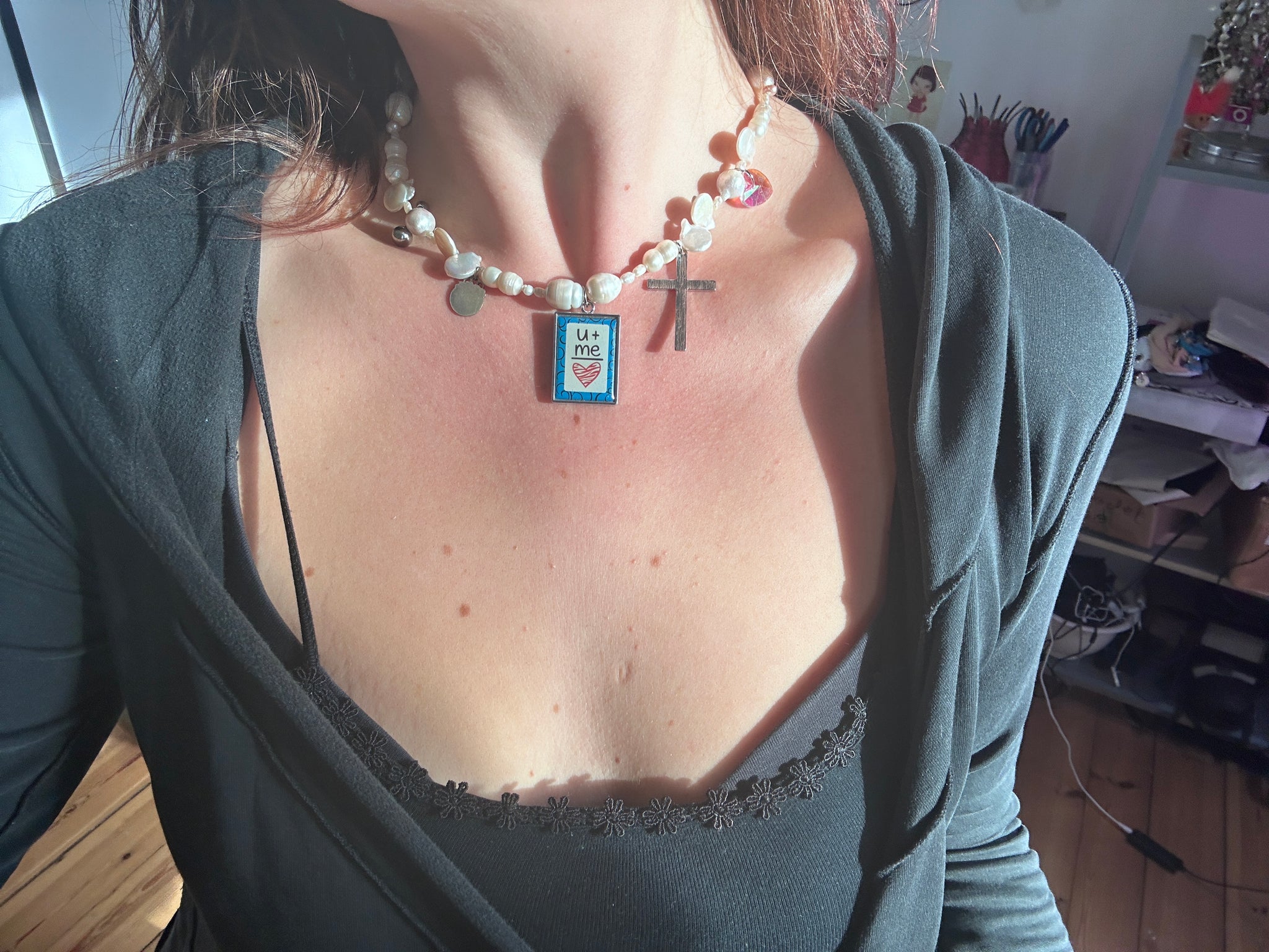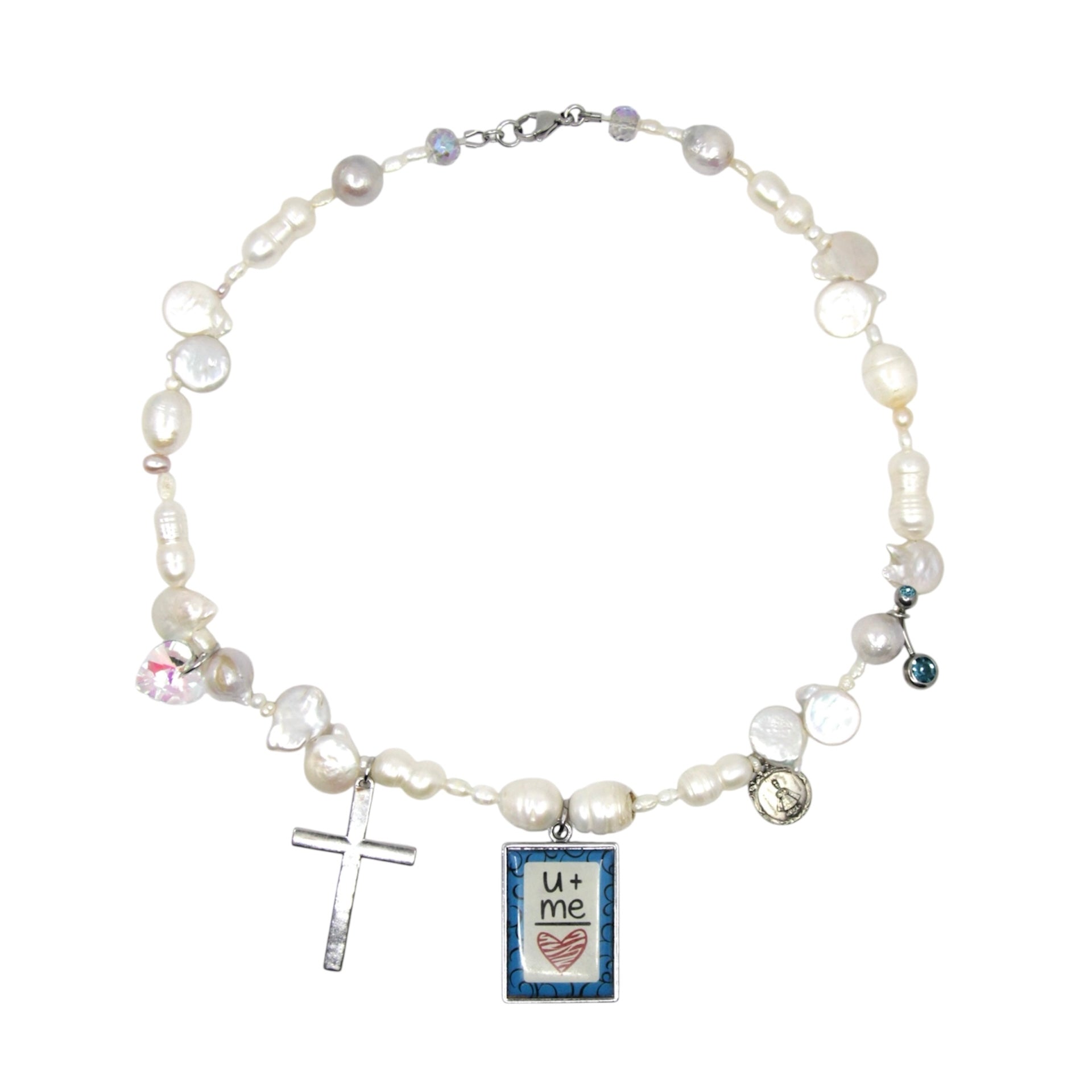 One of a kind necklace made with various up-cycled beads, including freshwater pearls in various shapes, secondhand charms and an up-cycled 'U + me' pendant.